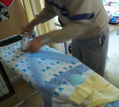 Here he is ironing out the 2 1/2 by 7 inch strips you need to begin. He cuts everything but 2 1/2 by 7 inch strips- so keep an eye on him and remind him often of the correct measurements. I find it helps if you cut the 2 1/2 and he cuts them into the 7 inches.