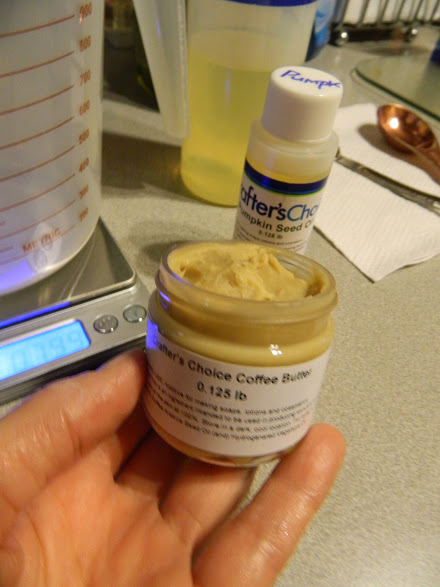 The rest of the oils get measured and the specialty butters get added and warmed. Today it is coffee butter and pumpkin oil. Mmmm......