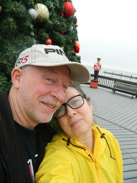 The pier is lit up at night. There goes The Mister and Pup in the fog to see where the lights lead.