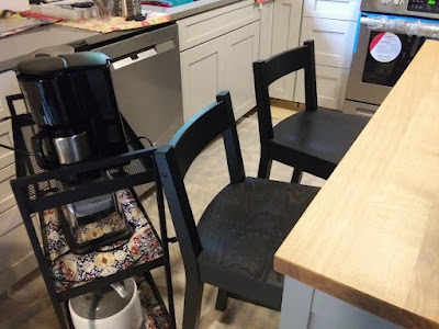 I had gotten a new rice cooker, a new electric kettle and a few weeks ago I bought a new coffee maker and had no place to put them. Now they roll around on their own little Ikea cart instead of cluttering up my new counter top. I am also trying not to scald the front of my new cabinets with them. The old cabinets were a mess from the steam that these thing put out so the cart will be rolled as far away from the cabinets as I can get it when in use. I also got two chairs of the right height for the island. Our old ones were too tall and we had to bend practically in half to eat.